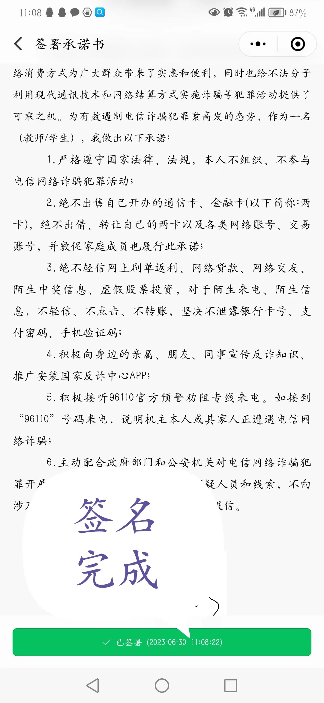 为贯彻落实上级部门关于防范电信网络诈骗工作的相关部署,根据学校主题教育相关专项整治要求,为强化师生反诈防骗意识,进一步增强识诈防骗能力,特开展“反诈防骗云签名”活动。