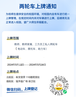 为进一步加强校园秩序和交通安全管理,解决占用、堵塞消防通道以及乱停乱放等突出问题,为师生营造良好的教学、工作和生活环境,结合伟德bv1946官网实际情况,现对校内教职工电动单(摩托)车进行实名登记上牌管理。现将相关事项通知如下: