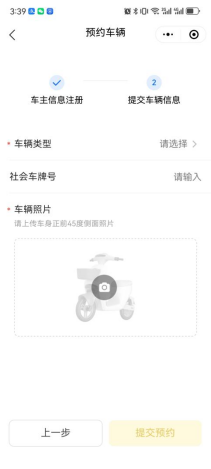 第四步:填写车辆信息。注意车辆照片请上传正前45度侧面照片,然后提交预约。