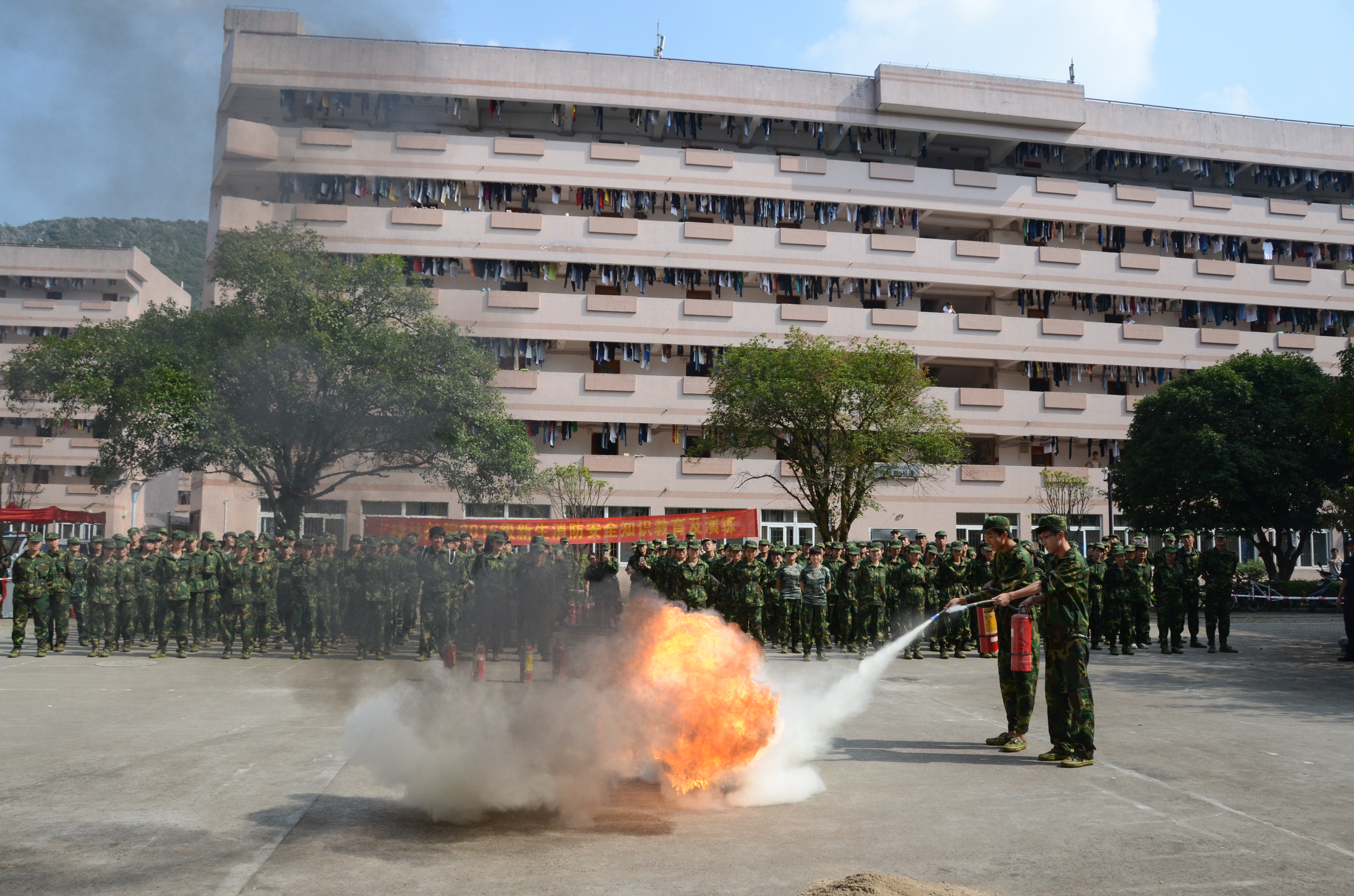 随后的演练中,同学们在消防大队教官的指导下,积极参与消火栓、消防水带、消防水枪的对接练习,并严格按照“拔插销、按压把、灭火根”的操作要领,使用干粉灭火器以标准规范的动作迅速将油盆的大火扑灭。