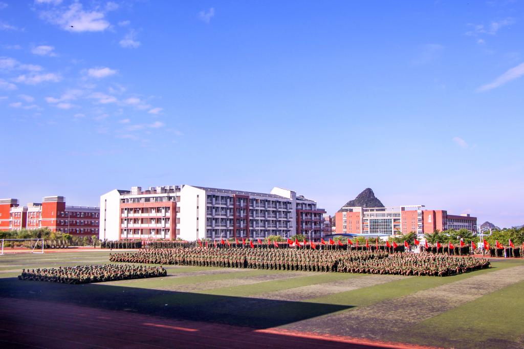 由13个连队组成的巨型造型方阵不断变换出“GLHT”(桂林航天)、“2017”、“10”至“1” 倒计时以及 “前进箭头”的造型;22个分列式方阵伴随着昂扬的检阅进行曲迈着正步、高喊口号、精神抖擞地依次通过主席台,接受学校领导和部队首长的检阅。随后,进行了卫生连战地救护和军体拳方阵的擒敌拳表演,他们娴熟的包扎技艺和精彩的拳术表演展现了桂航学子的飒爽英姿,也赢得了在场师生的热烈掌声。