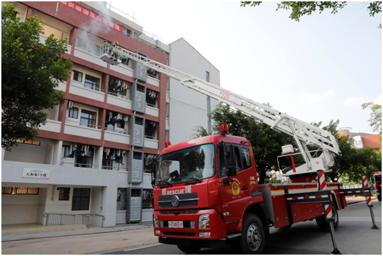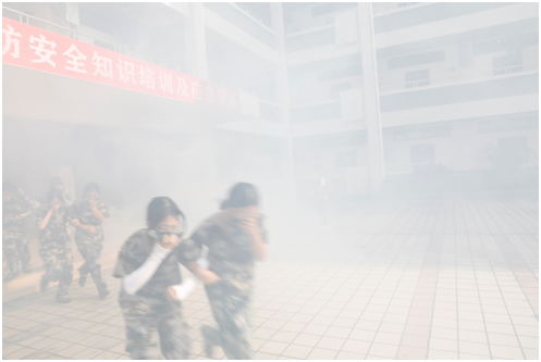 活动首先以天和苑7号学生公寓发生火灾为假设,随着火警警报铃声响起,消防安全应急演练正式开始,学校保卫处接到火灾报警信号后,立即指派安保人员到达现场,指挥引导楼内学生有序疏散,安保人员马上拨打火警电话“119”,详细告知起火地点,并指派交通引导人员到达学校大门,引导消防车辆顺利进入校园。消防员利用地面消火栓,向五楼外阳台喷水灭火。消防云梯登高将“被困者”救出, “火灾”被扑灭。整个应急演练过程安全、顺利、迅速、有序。