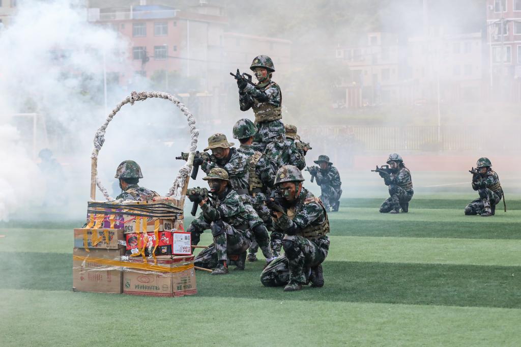 2023级新生军训会操典礼在雄壮的国歌声中正式拉开帷幕。二十个分列式方阵迈着正步、高喊口号、精神抖擞地依次通过主席台,他们飒爽的英姿,矫健的步伐,洪亮的口号,赢得了领导及师生们的阵阵热烈掌声。分列式后,八个方队依次进行了旗语表演、擒敌拳、捕俘拳、军体拳、刺杀操、女子匕首操、军事步操、战术演练汇报表演,表演柔美与刚烈并济,再次引燃了现场气氛。