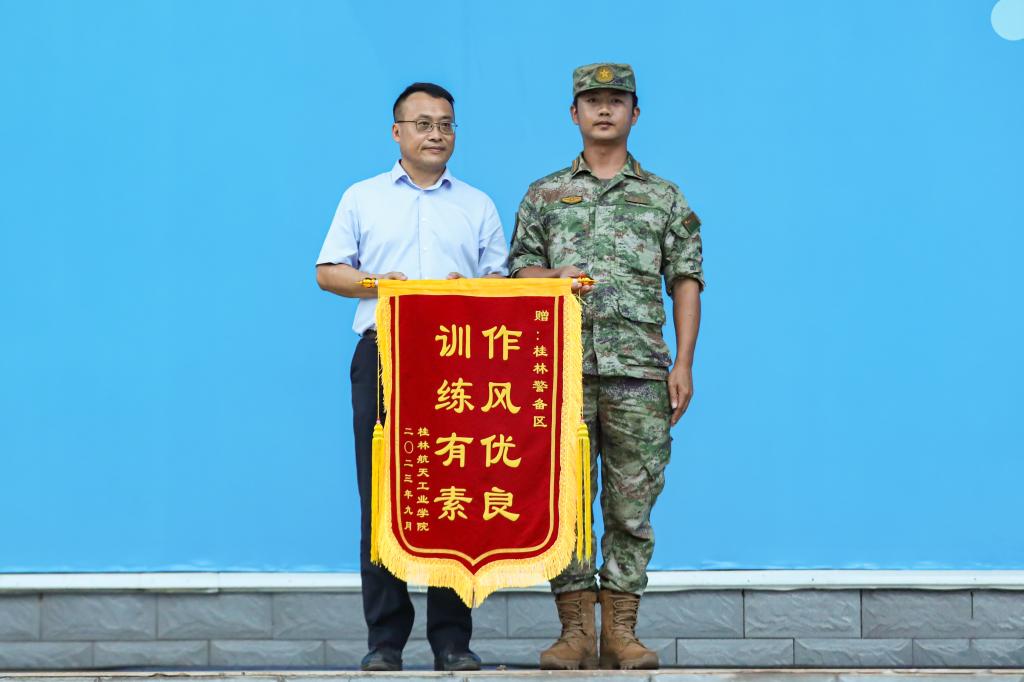 为感谢承训单位对伟德bv1946官网军训工作的大力支持,吴尽昭代表学校向承训单位桂林警备区赠送了锦旗。